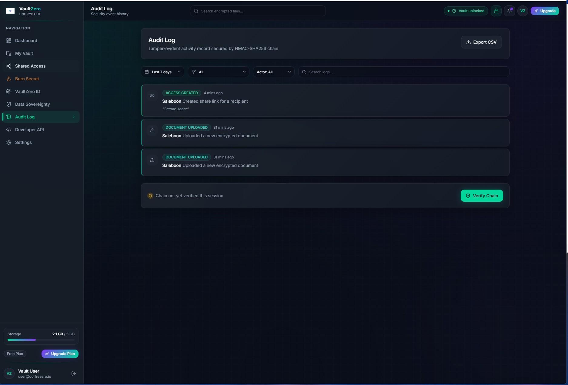 What sets CoffreZero apart is the depth of the security model: per-document random DEKs wrapped with NaCl SecretBox, sealed-box sharing for recipients, HMAC-SHA256 chained audit logs for tamper detection, burn-after-reading secrets, GDPR Article 17 erasure protocol, and forensic watermarking for leak detection.