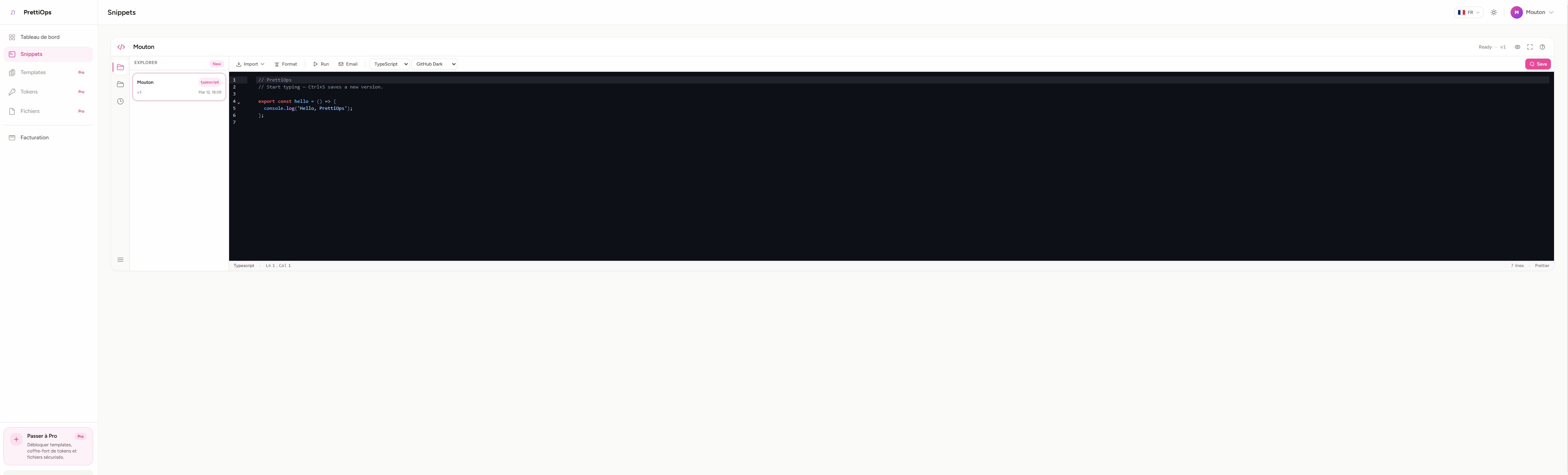 The editor supports 30+ languages and 6+ themes. Every snippet is version-tracked with Ctrl+S saving a new version.